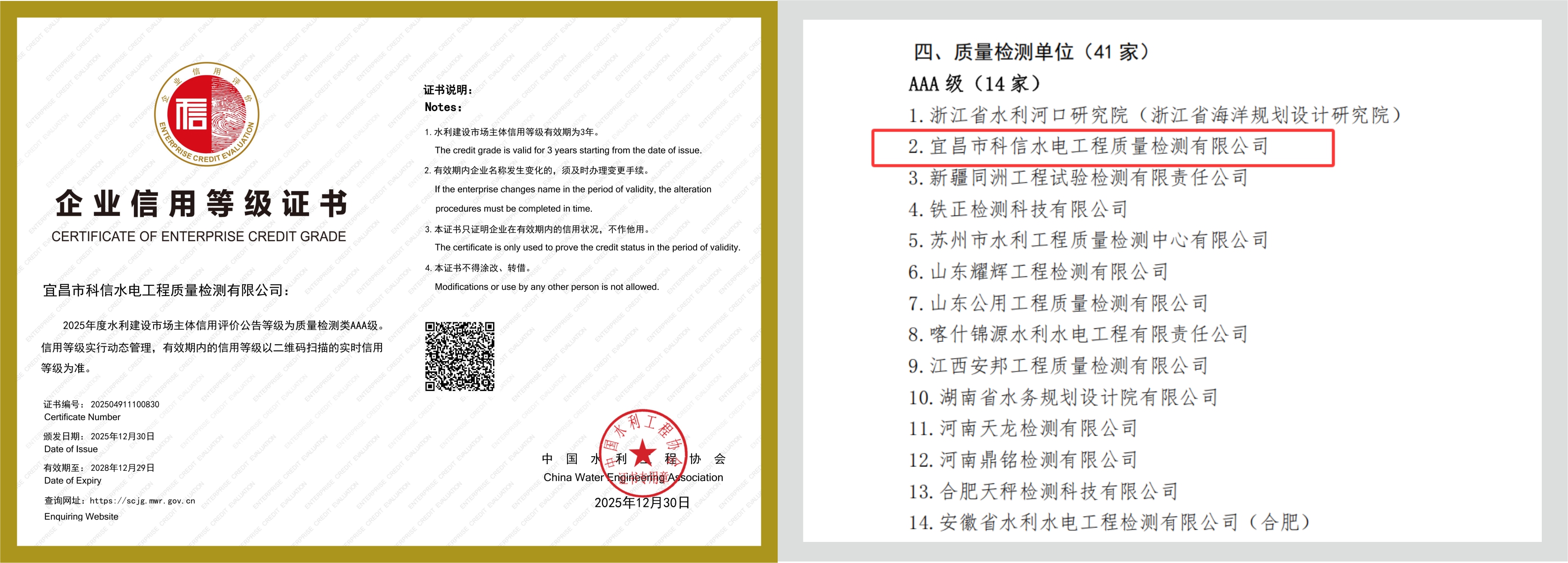 近日,中国水利工程协会正式发布2025年度全国水利建设市场主体信用评价结果,公司凭借卓越的技术实力、规范的服务体系及深厚的行业信誉,成功斩获最高等级AAA信用评价。此项殊荣不仅是行业对公司在水利工程质量检测领域专业能力与诚信经营的权威认证,更是对其长期致力于工程质量保障工作的高度肯定。